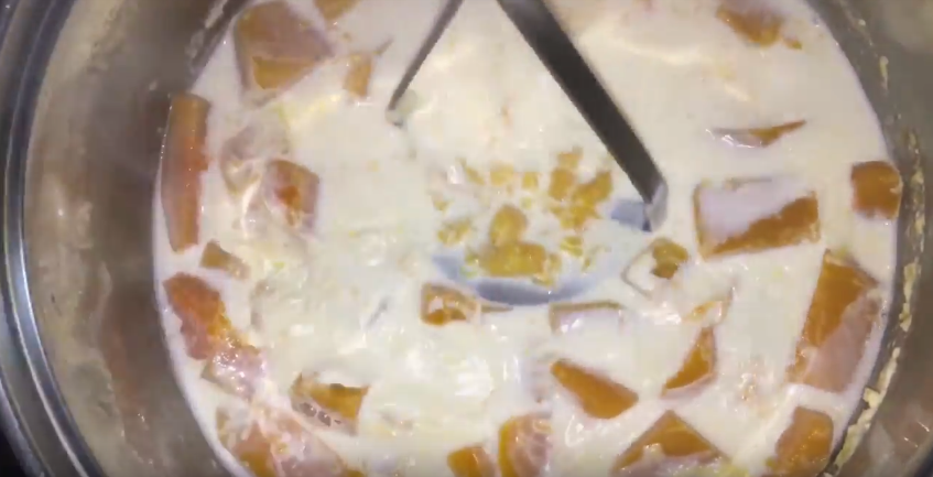 В это время чистят тыкву и нарезают ее небольшими кубиками. Складывают в маленькую кастрюлю, добавляют примерно полстакана воды и варят в течение 15 минут после закипания, а затем сливают воду и дают остыть. По истечении времени добавляют яйца, сахар и крахмал и при помощи блендера перебивают в единую массу.