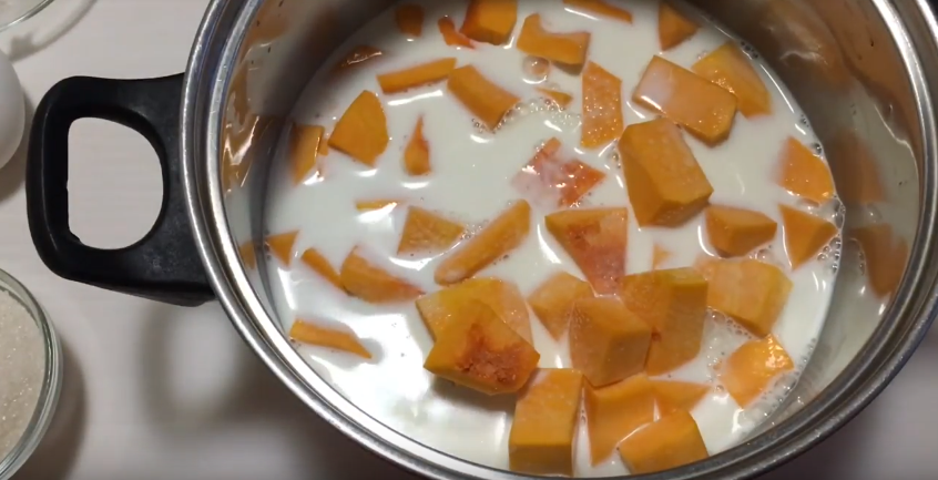1. Тыкву очищаем от кожуры и семян и режем на мелкие кубики размером 2х2 см. Кладем ее в кастрюлю, заливаем молоком, добавляем щепотку соли и ставим на средний огонь.