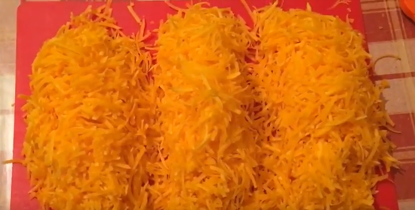 1. Срезаем с тыквы кожуру, режем на куски и натираем на крупной терке. Получившуюся массу разделяем на 3 части.