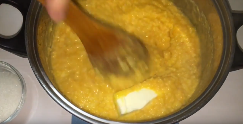 4. Тыквенная каша с пшеном готова. В принципе это уже готовое блюдо, которое можно кушать и так. Но у нас в планах запеканка, поэтому засыпаем в кашу сахар, добавляем кусок сливочного масла и разбиваем яйцо. И быстро перемешиваем, чтобы яйцо не успело свернуться.