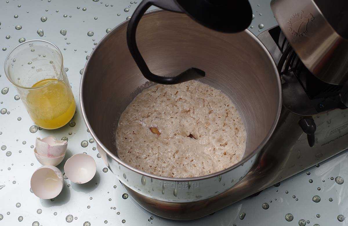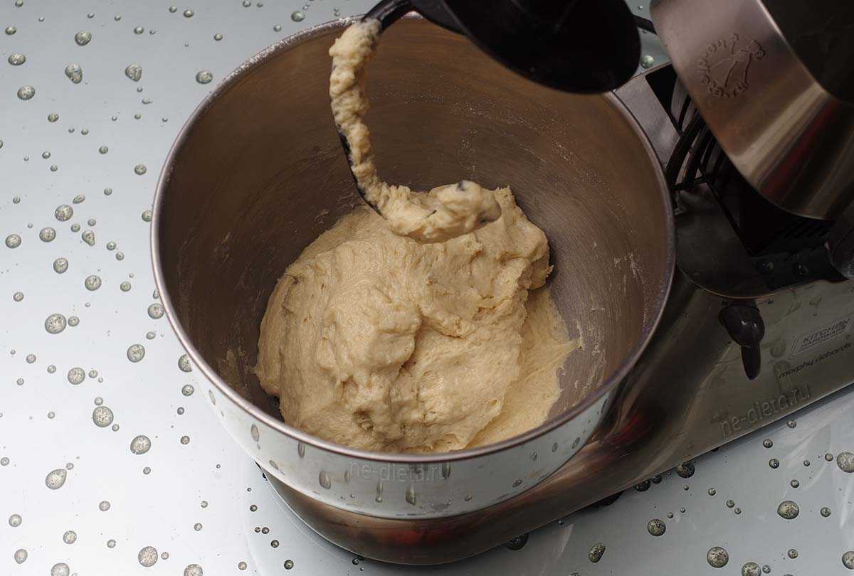 В 3 захода всыпать муку, просеянную с солью, и тщательно вымесить тесто руками или в кухонном комбайне с помощью насадки «крюк».