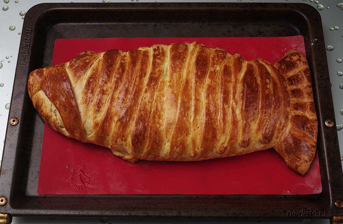 Выпекать рыбный пирог в разогретой до 190°С духовке 25 — 30 минут до сильного зарумянивания. Затем вынуть пирог из духовки, накрыть чистым полотенцем и оставить на столе на 10 — 15 минут. После этой процедуры его можно смело разрезать на порции и подавать к столу.
