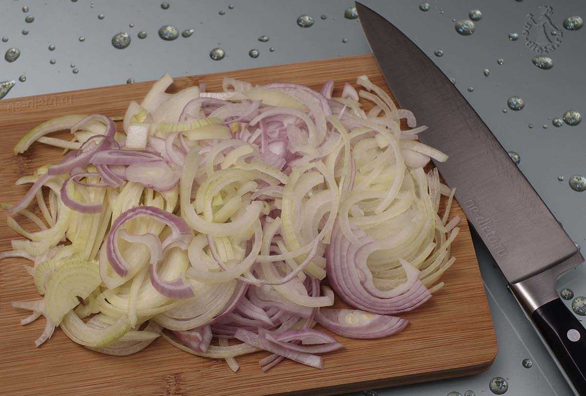 Пока тесто поднимается, займемся приготовлением начинки для дрожжевого пирога с рыбой. Для этого репчатый лук очистить и нарезать тонкими полукольцами.