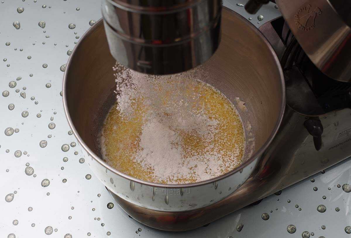 Всыпать муку с разрыхлителем, тщательно вымешать.