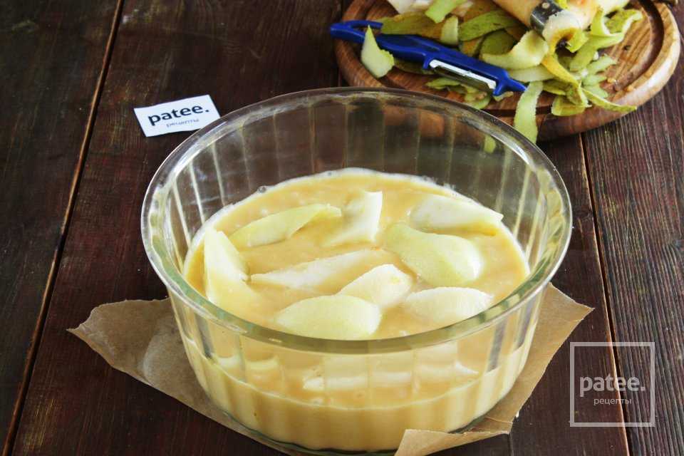 - Груши очистить, порезать, выложить сверху, притапливая.