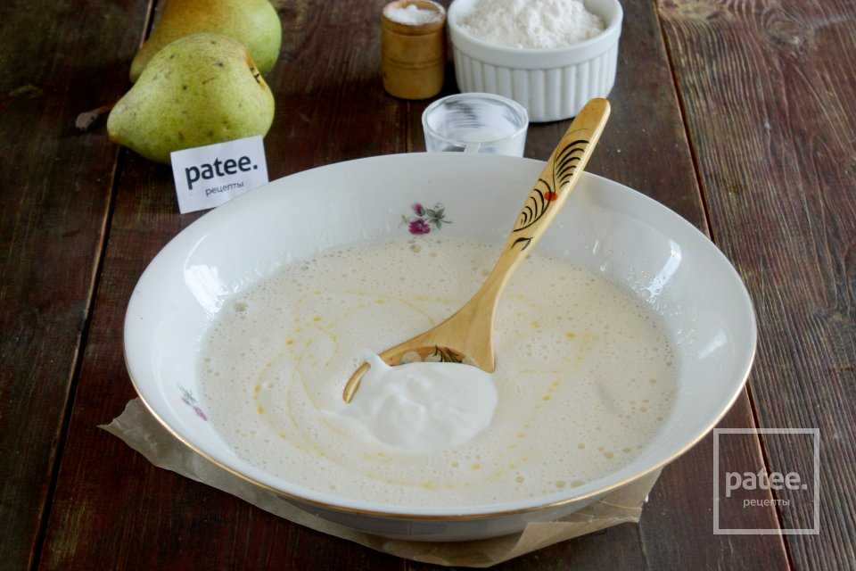 Также, как и по рецепту шарлотки, тесто этого быстрого пирога замешивается до вязкого состояния, но вкус и цвет мякиша заметно отличаются. Сметана плюс масло осветляют высокий корж и пропитывают сдобным сливочным ароматом. Кроме груш выбирайте кисло-сладкие яблоки, айву, крепкие сливы, персики, абрикосы.