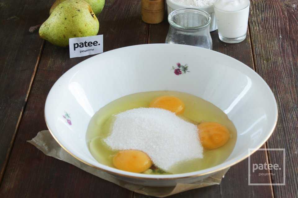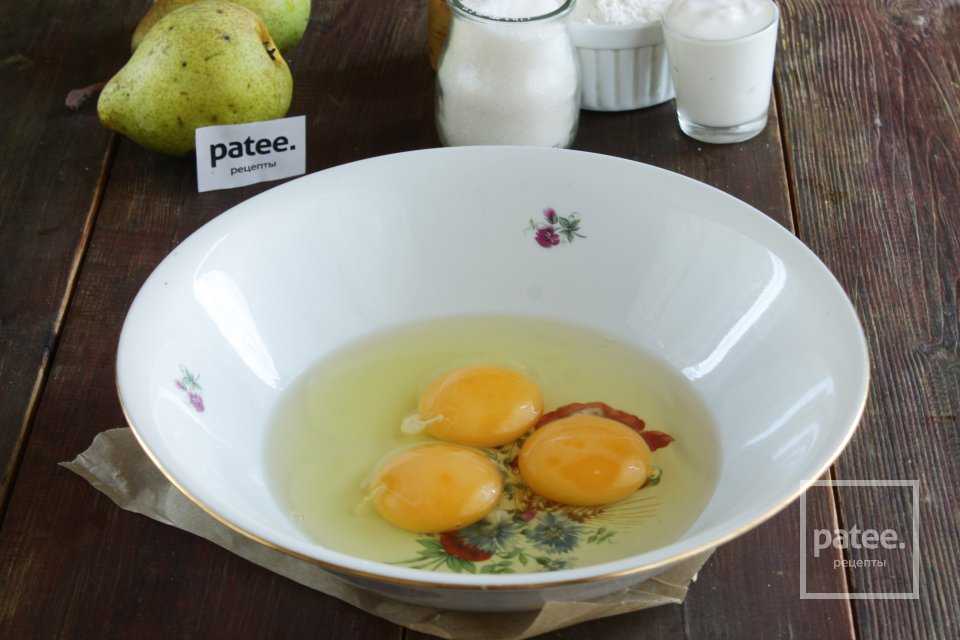 - Яйца поделите на желтки и белки. Отдельно взбейте белки в пену. Желтки разотрите с сахаром. Нарежьте пластинами груши, потрите шоколад в крошку (не слишком мелко).