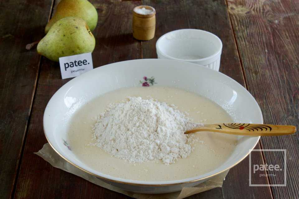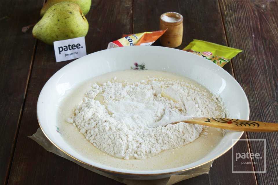 Бросаем разрыхлитель, который вспушит грушевый пирог и подарит пористую фактуру, а для усиления вкуса по щепотке всыпаем соль и ванильный сахар. Кроме того, выпечку можно ароматизировать цедрой, толченными орехами, медом, пряностями. Замешиваем гладкое тесто без единого сухого комка.