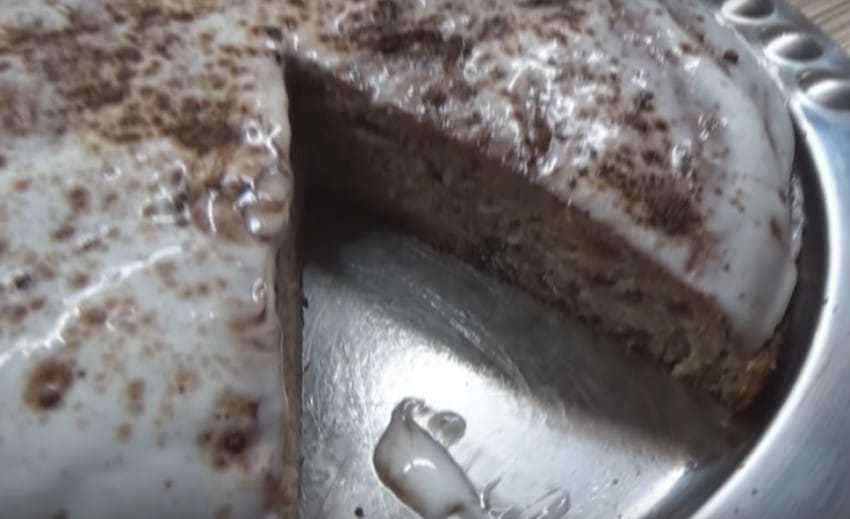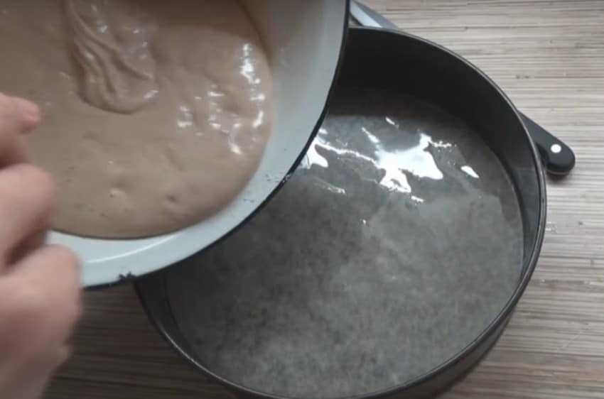 - Полученное тесто равномерным слоем распределить в форме для выпечки и отправить на 10-15 минут в разогретую духовку, где печь до золотистого цвета.