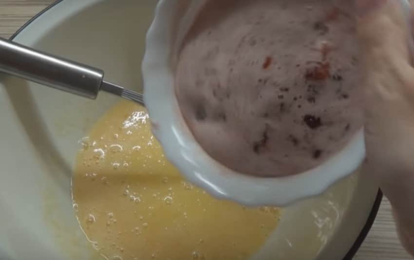 2. В другую миску разбейте яйца, добавьте к ним сахар и взбейте миксером до пышной пены. Затем отправьте к ним настоявшееся «содовое» варенье и тщательно перемешайте.