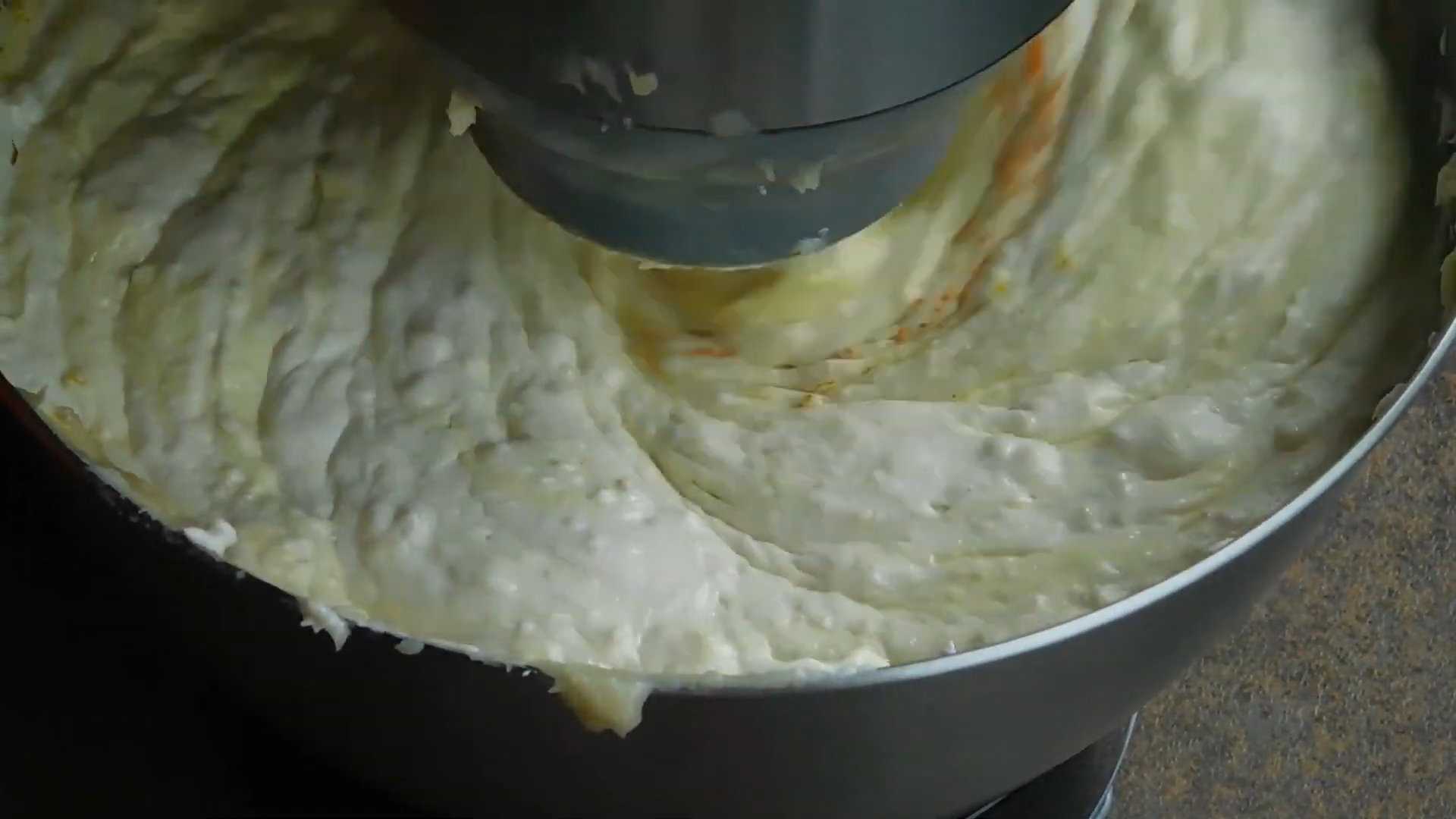 Не прекращая взбивание, небольшими порциями вводим остывшую заварную основу.