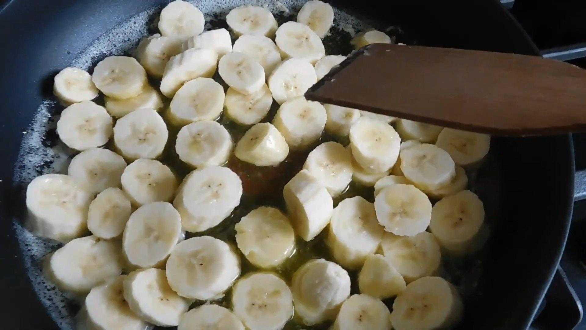 Как только масло закипело и бананы стали мягкими, всыпаем 100 г сахара и все хорошо перемешиваем.
