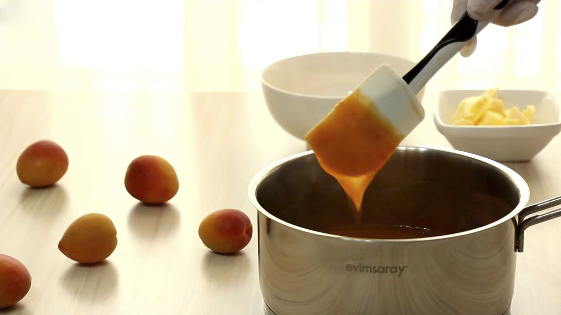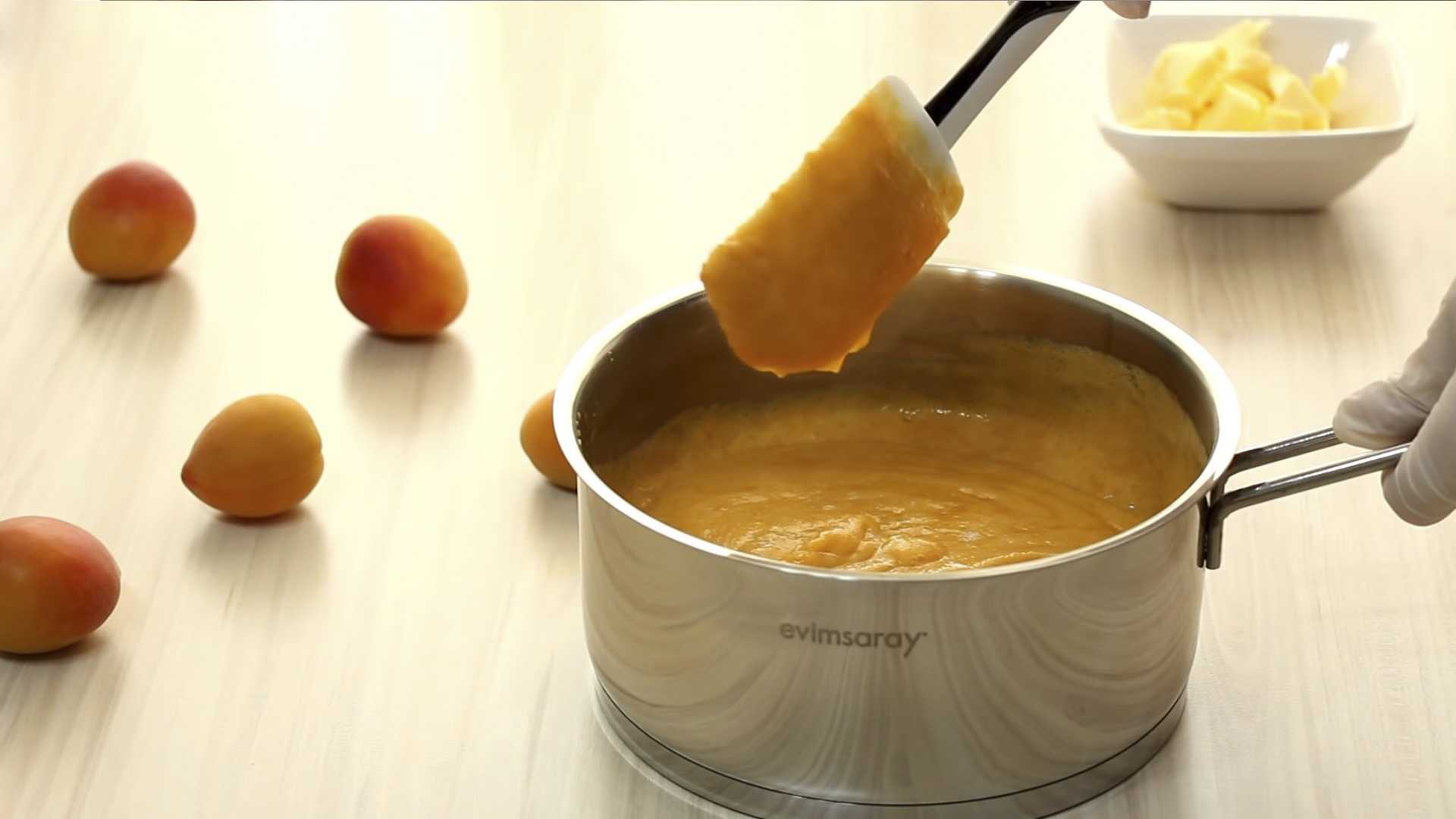 Перемешиваем ингредиенты и ставим сотейник на медленный огонь. Варим абрикосовую массу, постоянно помешивая, до загустения.