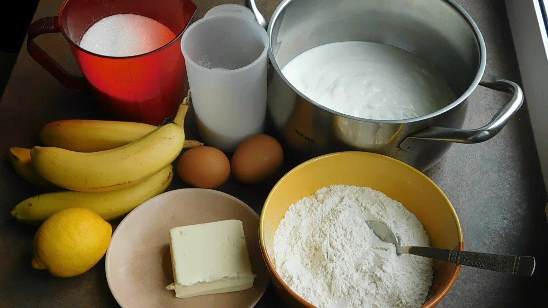 Сметану переливаем в кастрюлю с толстым дном. Добавляем к ней яйца, оставшийся сахар, банановое пюре, муку и тщательно перемешиваем ингредиенты венчиком до однородности.