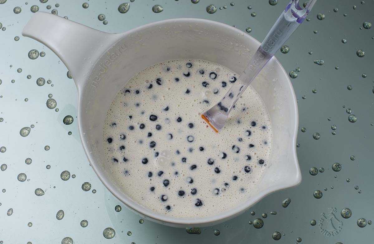 - Муку просеять с содой и добавить в тесто. Хорошо перемешать и добавить чернику, смешать еще раз, чтобы ягоды равномерно распределились по тесту;