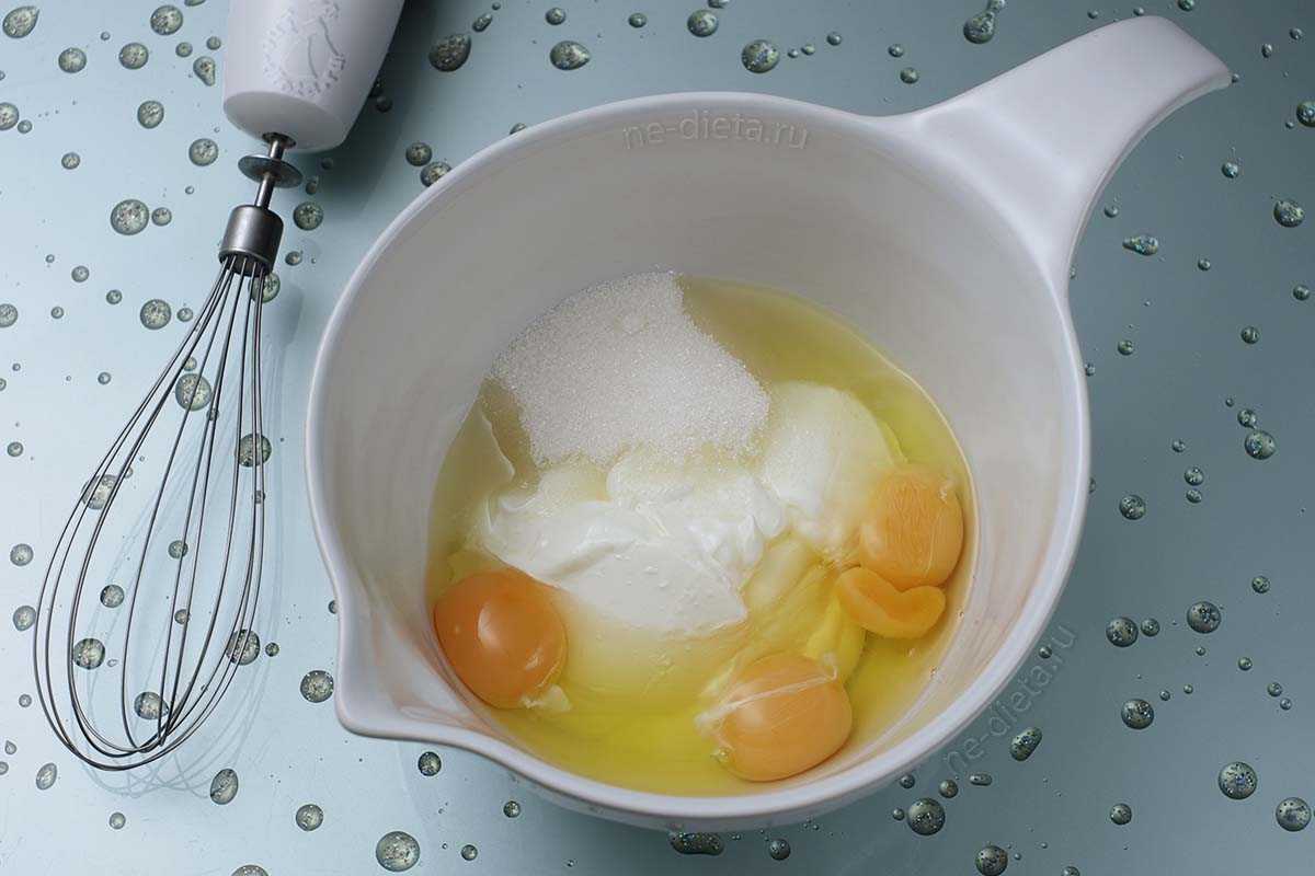 - Соединить яйца с сахаром и хорошо взбить пока не растворится весь сахар. Добавить сметаны, ванилина и продолжить смешивать до однородности всей массы;
