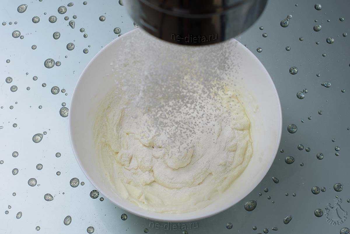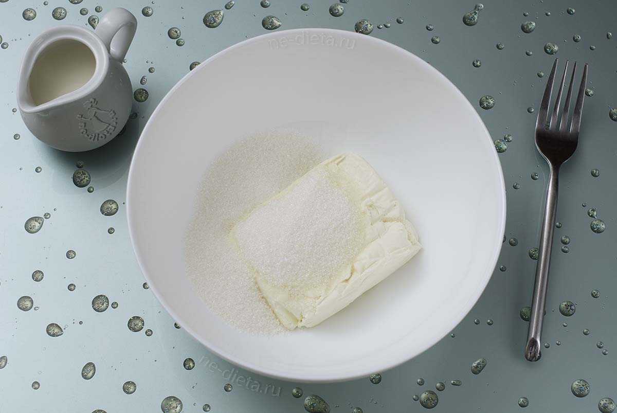 - Затем в отдельной посуде смешиваем крем-чиз, сахарную пудру, ванильный сахар и все тщательно размешиваем.
