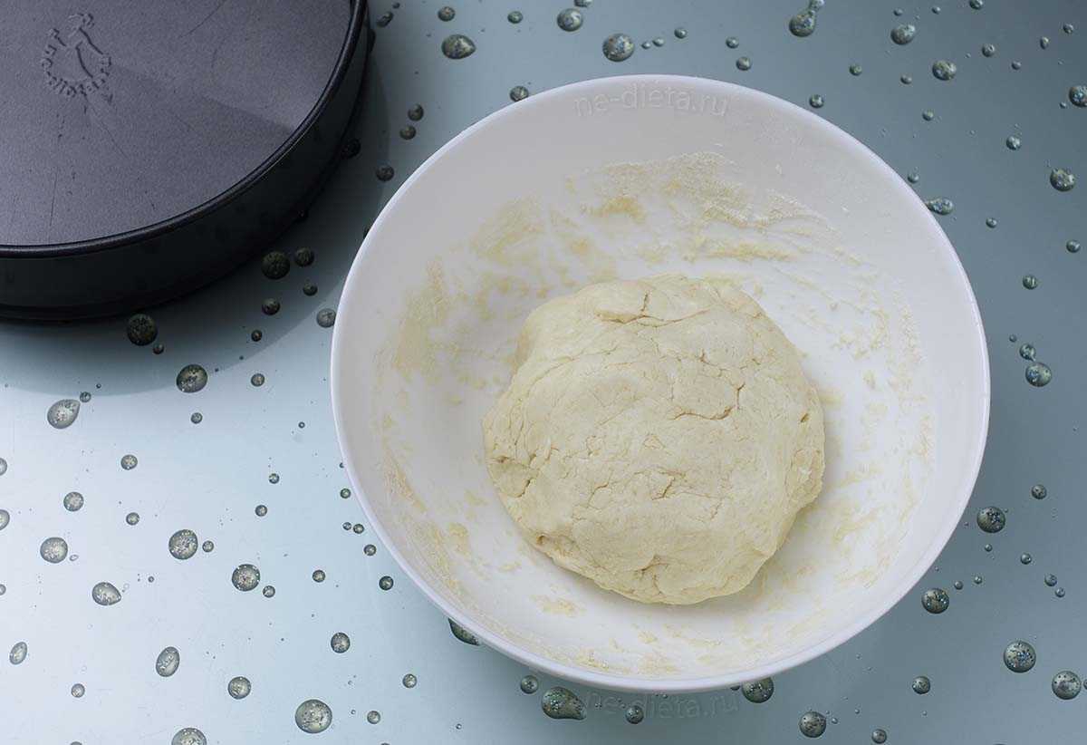 Вынула тесто из морозильной камеры, распределила его прямо руками по смазанной маслом форме размером 18х24 см (если берёте круглую, то это примерно d=23 см). Сделала бортики, наткнула вилкой.