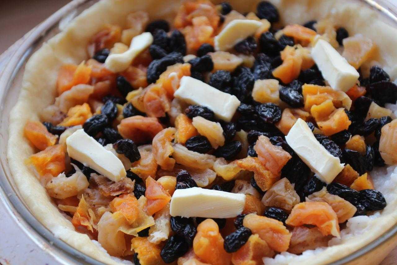 - Из миски с курагой и изюмом слить воду, а сухофрукты выложить поверх риса и равномерно распределить.