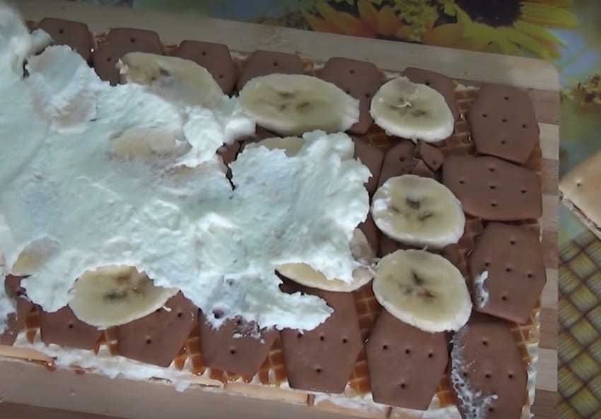 4. Собираем торт: загустевший крем достаньте из холодильника и промажьте равномерно первый готовый корж. По аналогии соберите все слои один на другой. Последний кремовый слой накройте пустым вафельным коржом и слегка спрессуйте. Бока обязательно промажьте остатками крема, чтобы десерт был равномерно пропитан.