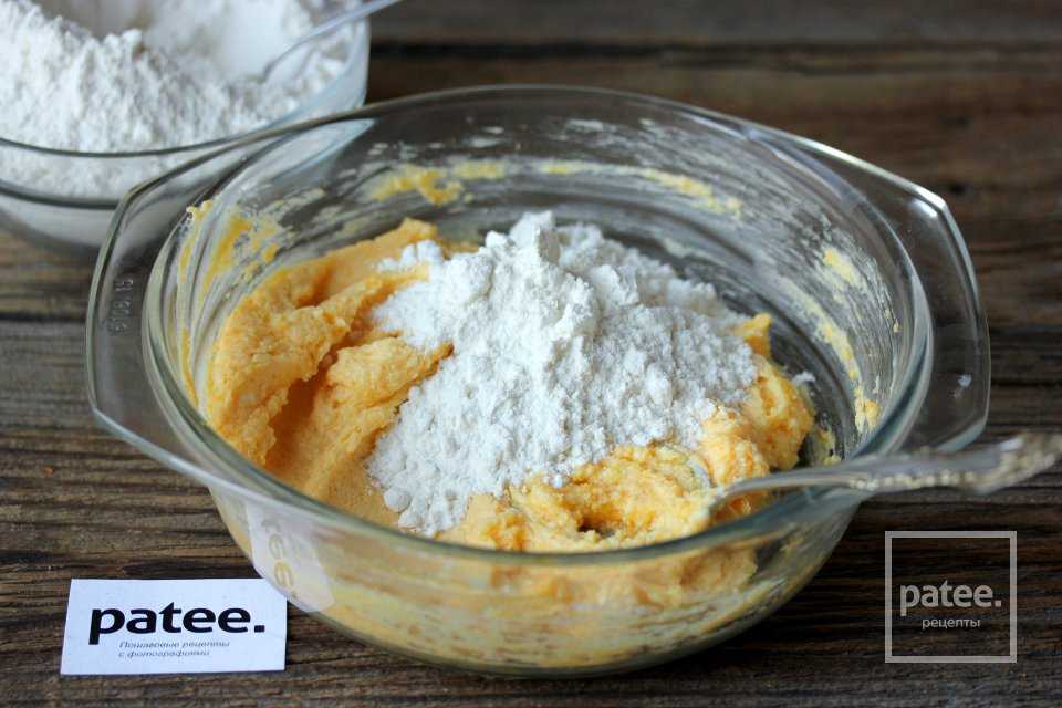 По ложке всыпаем в желтково-тыквенную массу пшеничную муку.