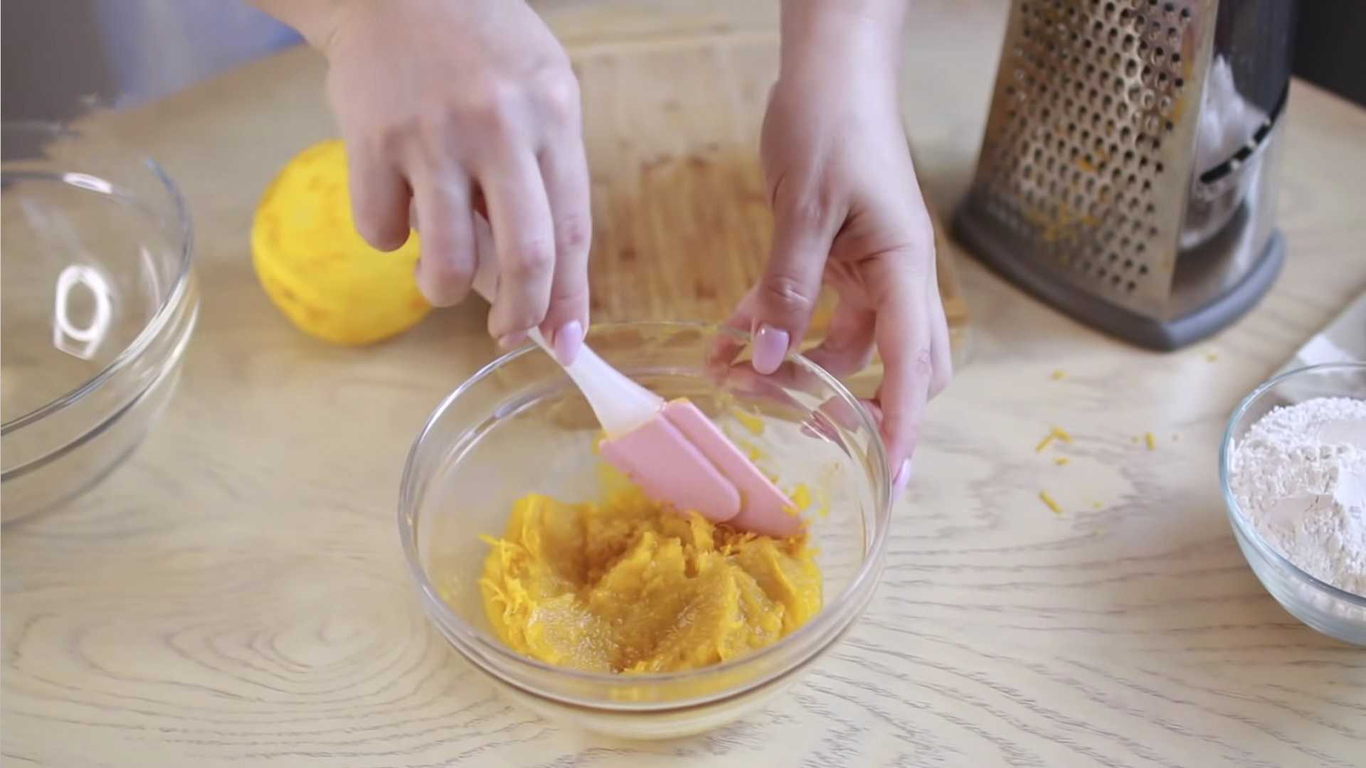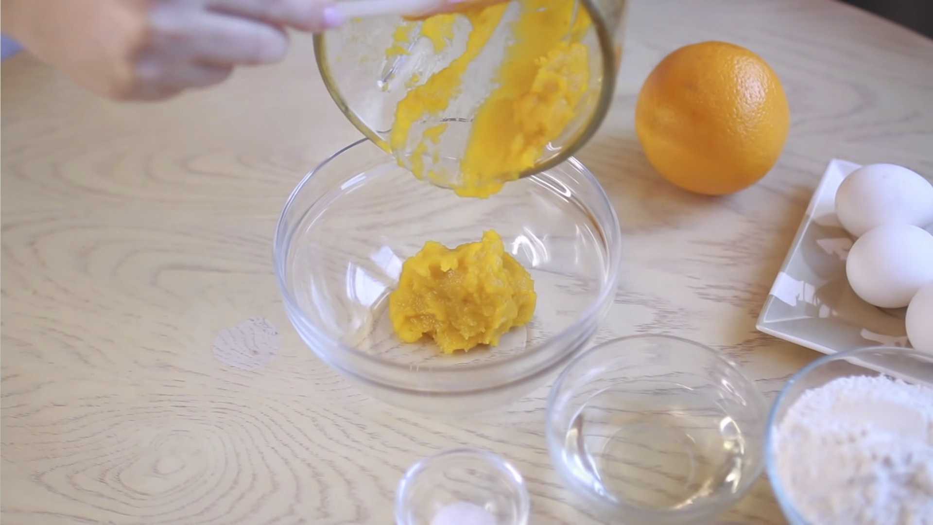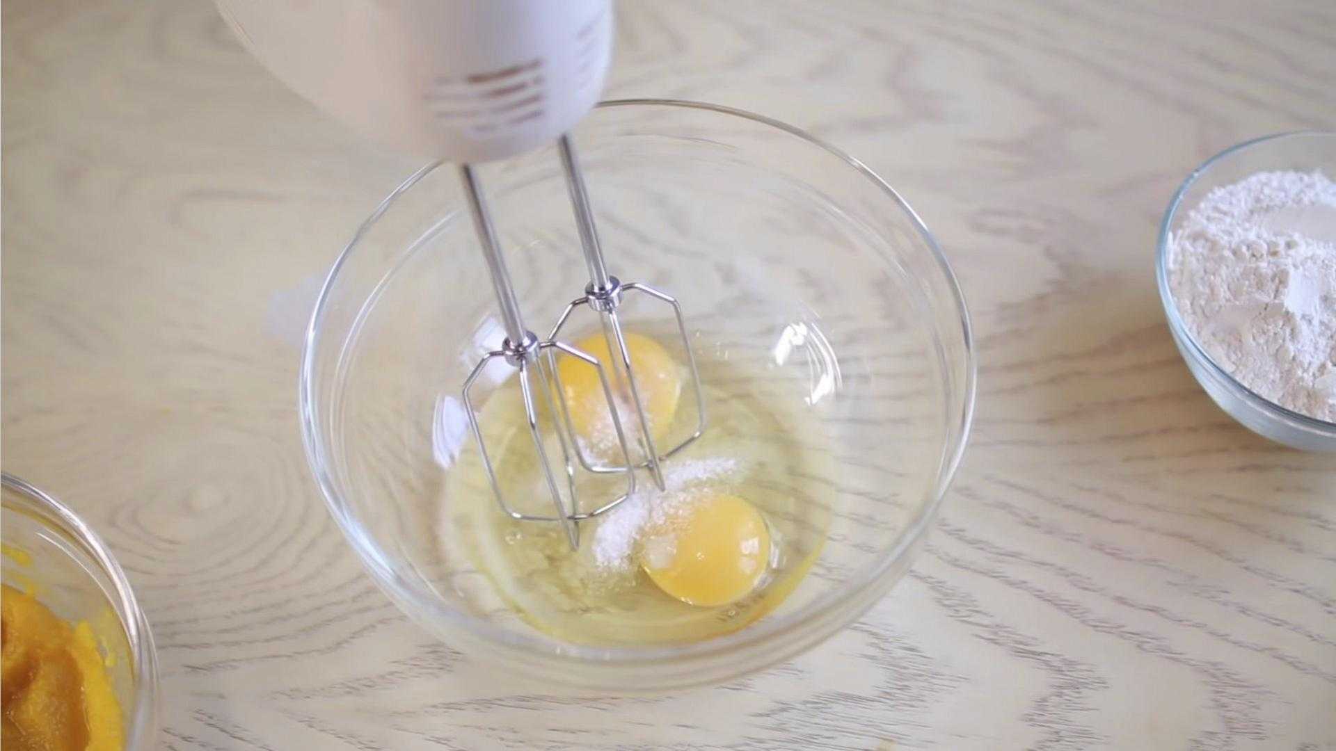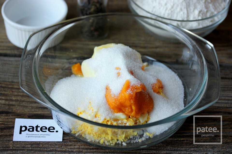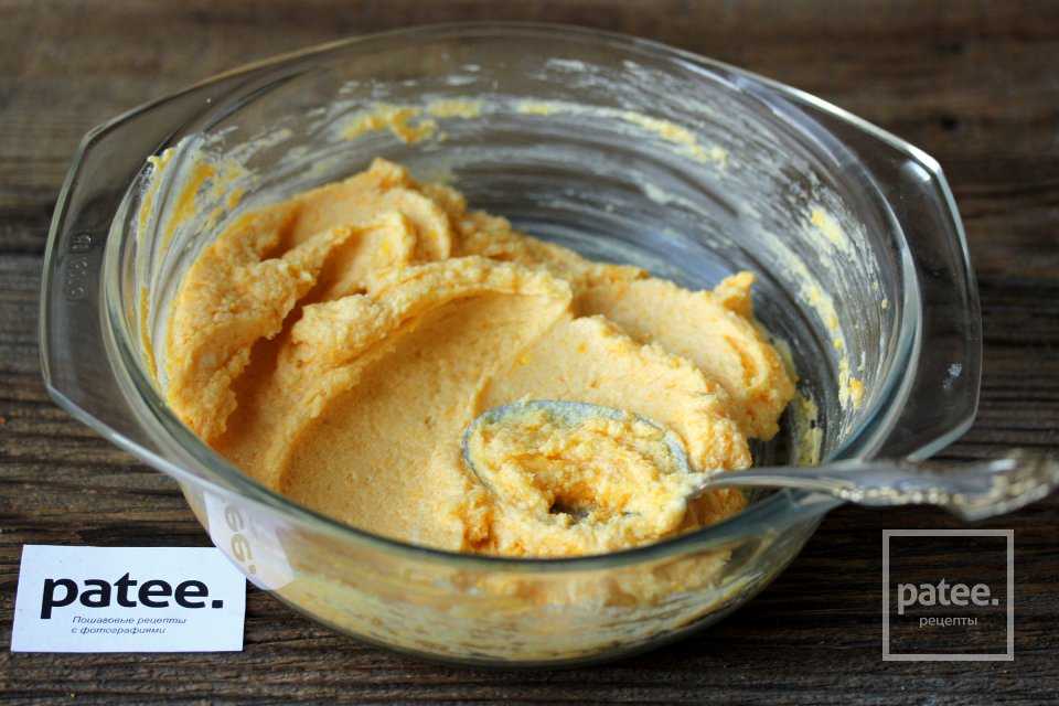 - Сахар с яйцами тщательно взбить добела, соединить с тыквенным пюре, размягченным маслом.