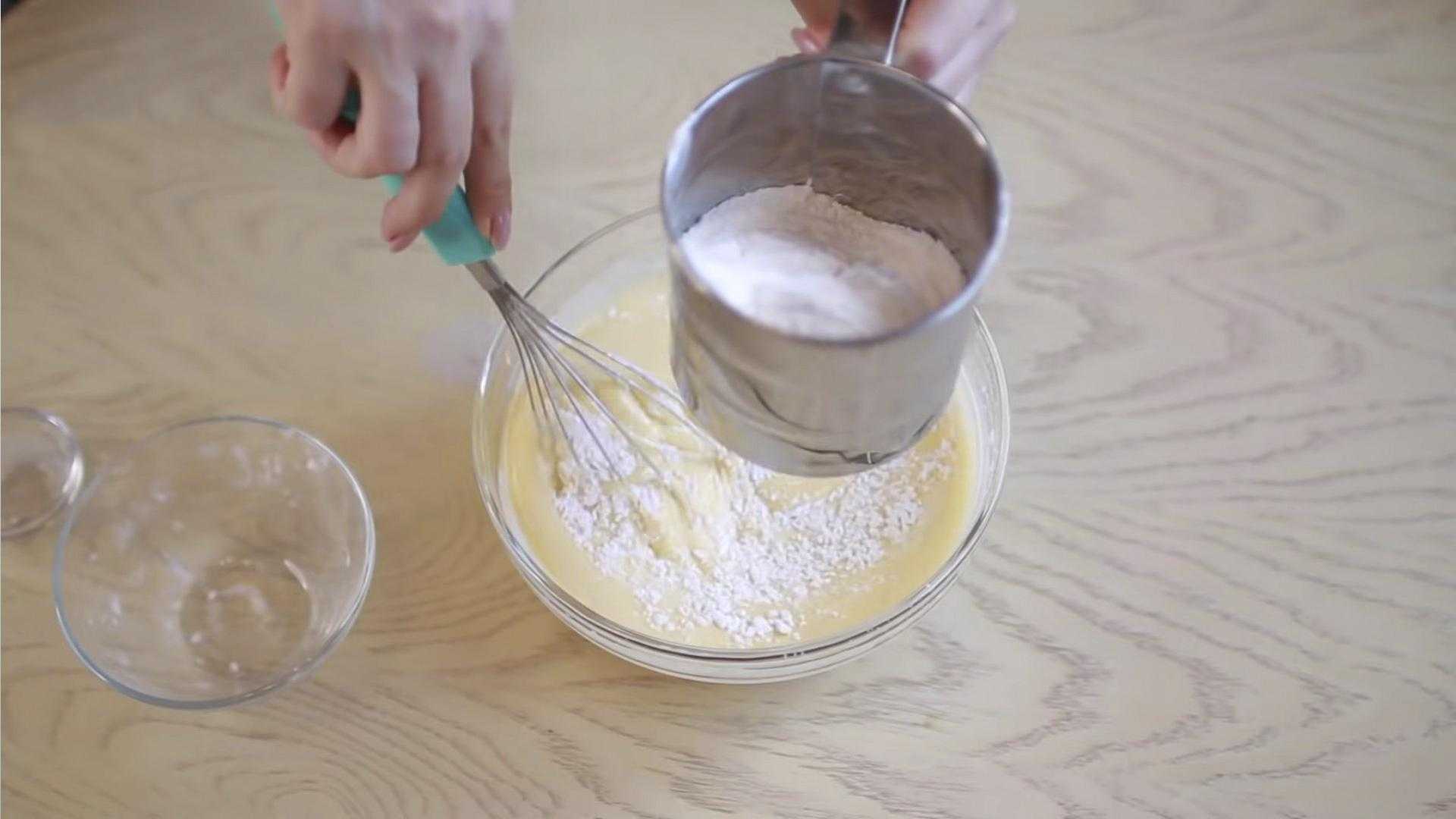 - Муку просеять, смешать с разрыхлителем, после этого небольшими порциями добавлять в жидкую основу, замесить тесто.