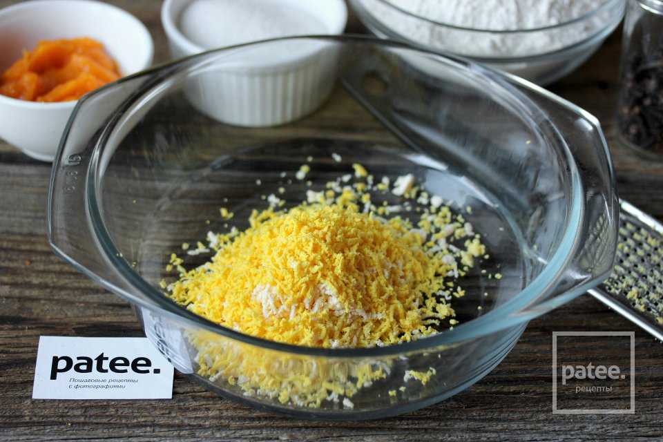 Отвариваем вкрутую куриные яйца, даём им остыть, очищаем от скорлупы и отделяем желтки от белков. Белки использовать мы не будем (их можно использовать для приготовления салата “Зелёный монстрик” http://www.patee.ru/recipes/salads/view/?id=312460), а желтки натираем на мелкой тёрке.