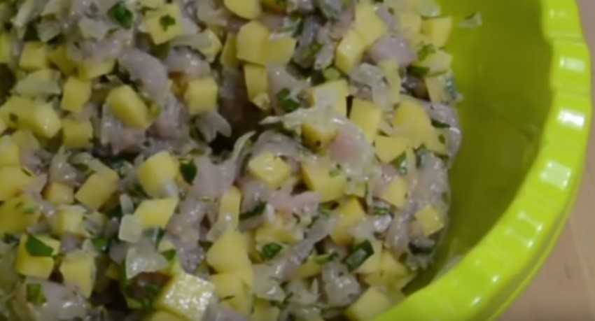 2. Куриную грудку порежьте соломкой, картошку мелкими кубиками, зелень измельчите. Мясо перемешайте с зеленью и картошкой, посолите и поперчите. Добавьте остывший жареный лук, хорошо перемешайте начинку.