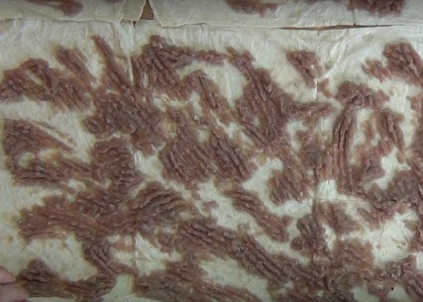 1. Любой мясной фарш с луком посолите и поперчите по вкусу, хорошо перемешайте. Выложите на листы лаваша и равномерно распределите по ним мясную начинку.