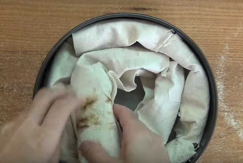 Перемещаем половину теста в подготовленную форму . Выравниваем верх.