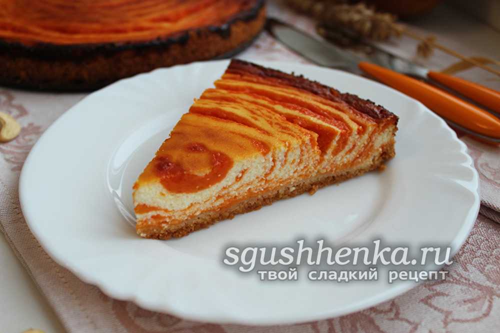 Форму для выпекания смазывают маргарином и посыпают мукой, на дно выкладывают 1/3 часть теста. Затем тыкву очищают, удаляют семена и мелко натирают, выкладывают вторым слоем. Сверху покрывают еще 1/3 частью теста и выливают творожную массу. В конце распределяют по поверхности оставшуюся крошку. Сверху тонкими пластинами нарезают 30 г сливочного масла. Выпекают при 180 °C около 30-40 минут, остужают и подают к столу.