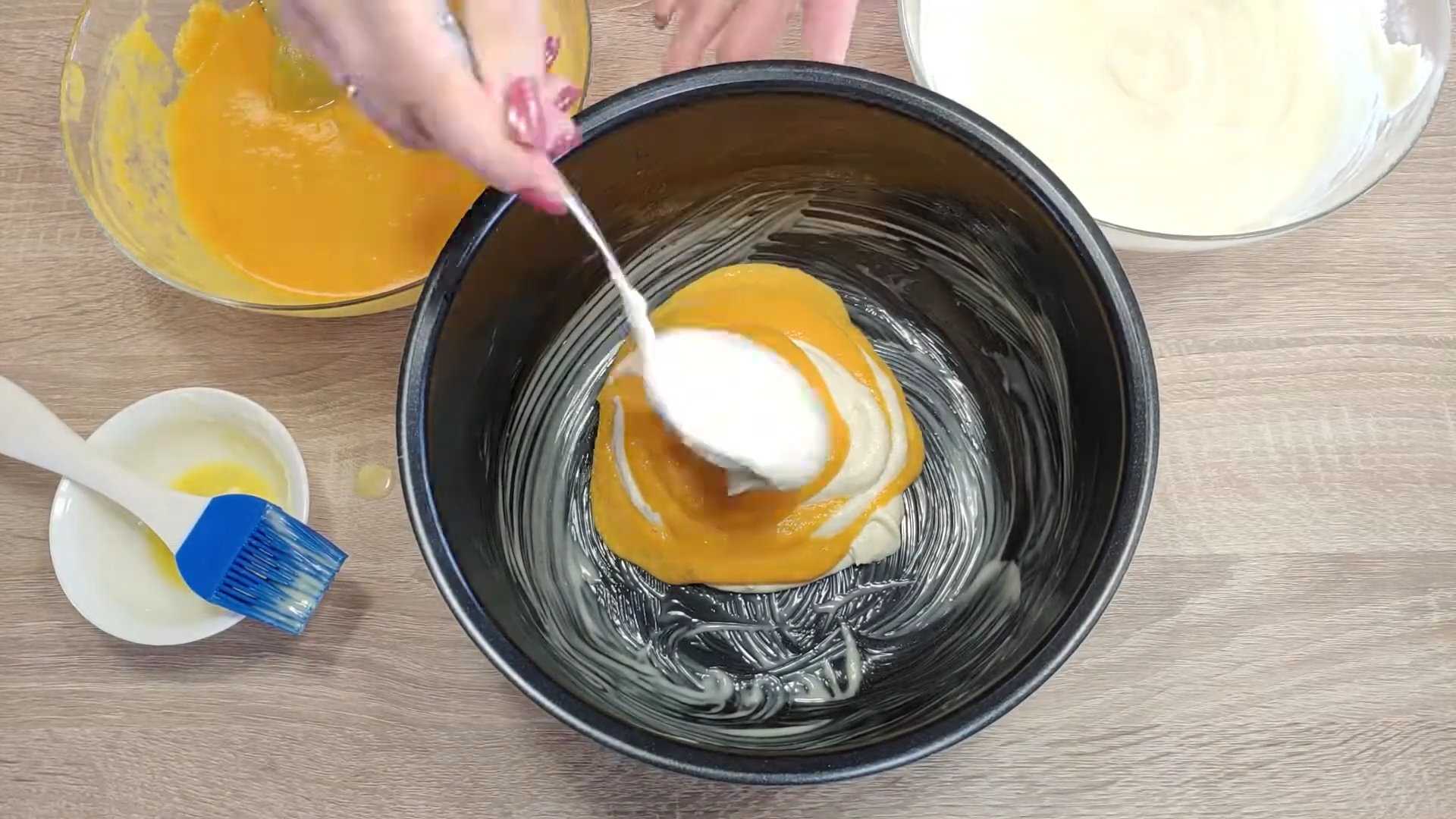 Тыкву и цедру заранее натерли, добавляем их в тесто и выдавливаем из апельсина сок.